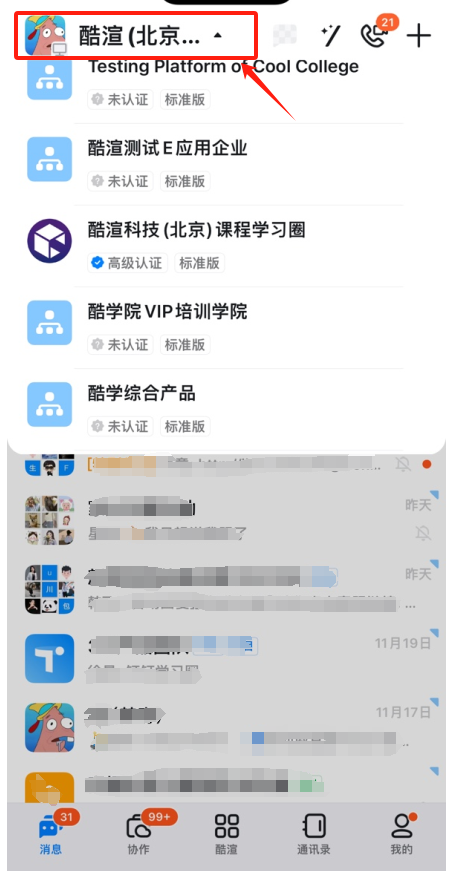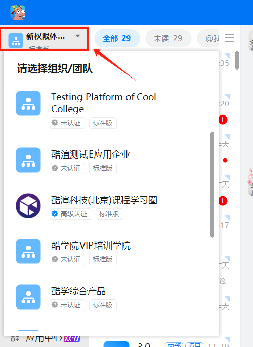 PC端--切换组织架构(先选择其他组织架构,然后在切换到需要的组织架构)