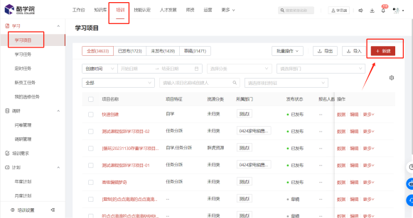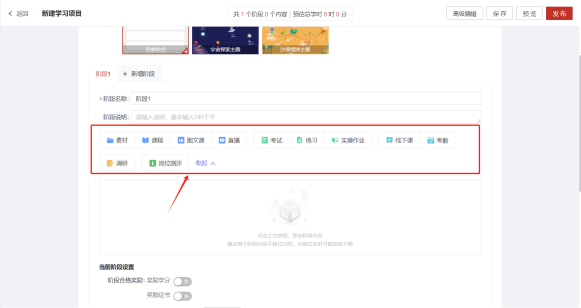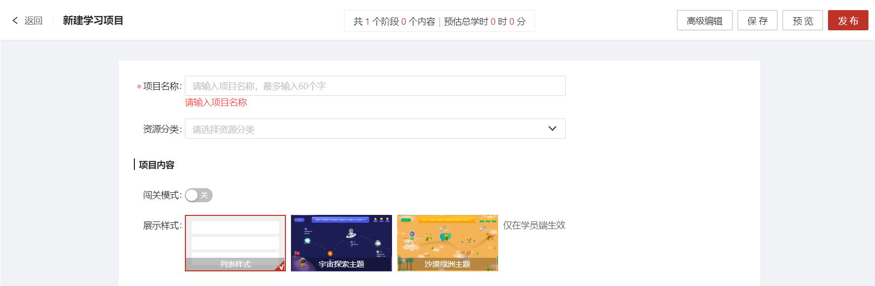 完善学习项目信息,例如项目名称、资源分类、展示方式等(带红星为必填项)