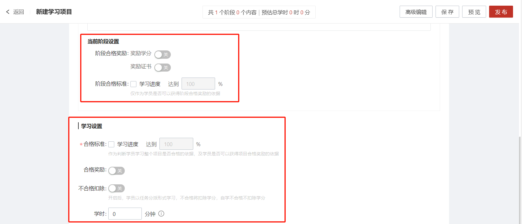 设置学习项目合格标准
