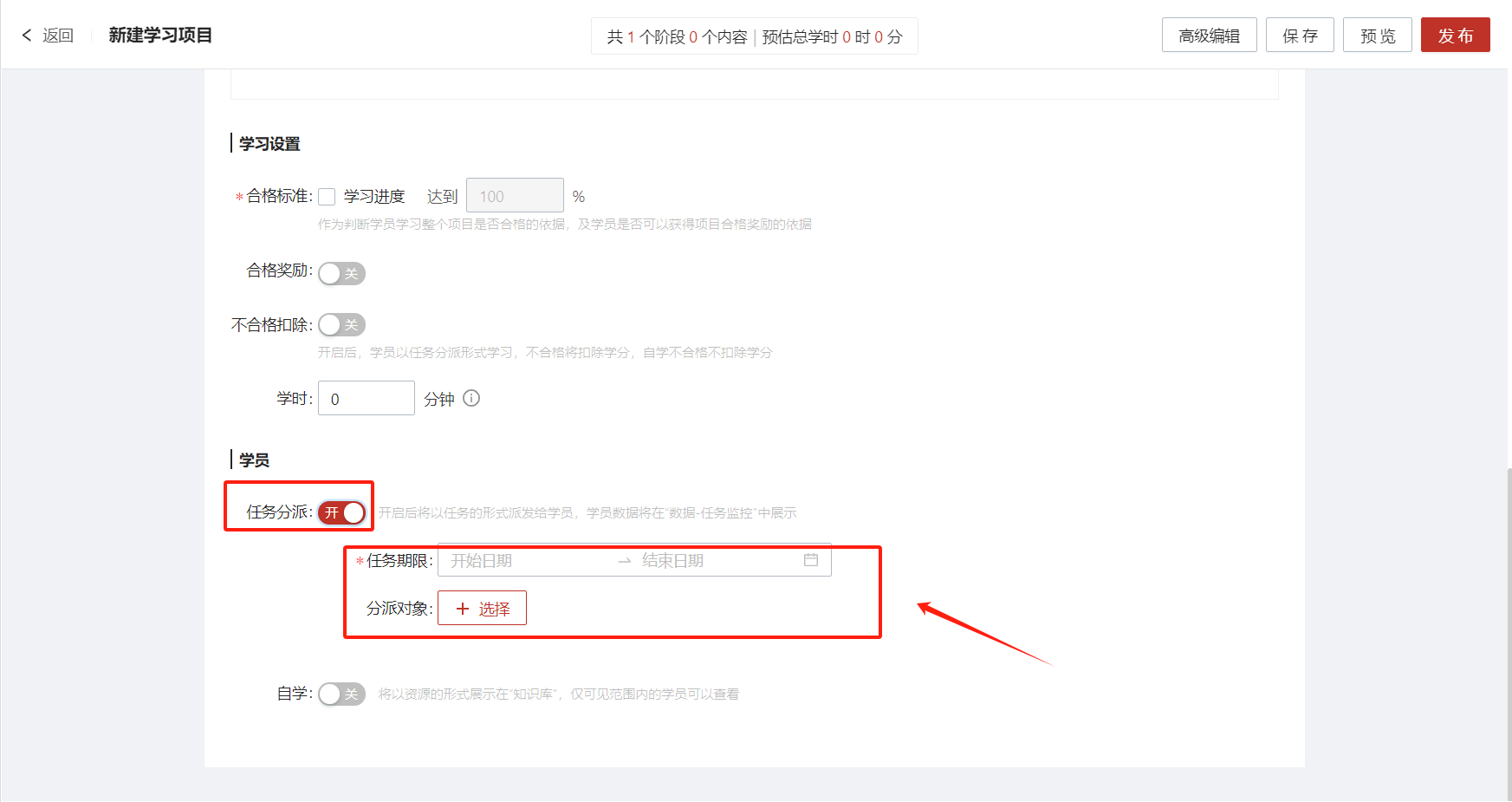 设置学习项目任务分派对象(任务期限及对应学员)