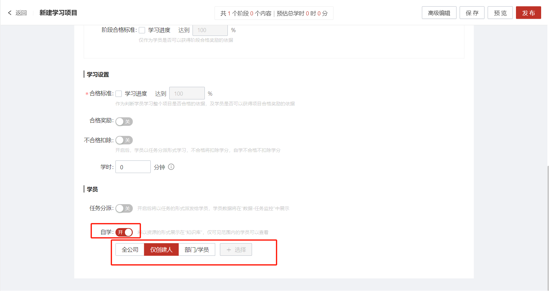 或学员只需自学形式,则打开自学按钮,设置可见范围即可