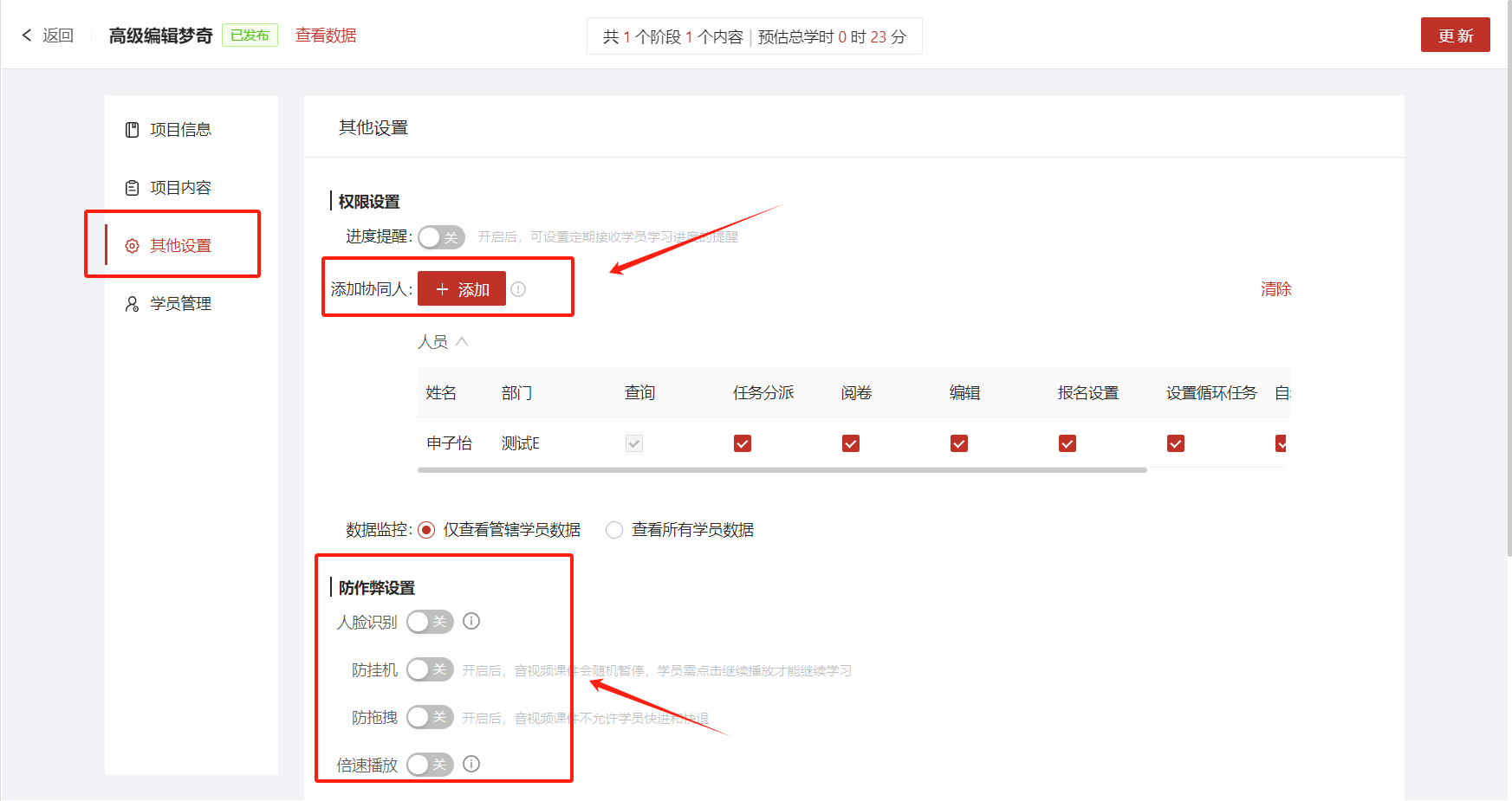 根据需求填写项目信息,添加项目内容,在【其他设置】中开启防作弊设置/添加项目协同人