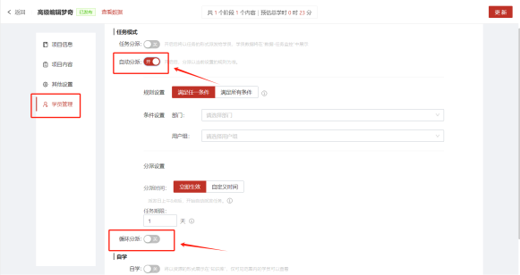 若管理员对学习项目需设置自动分派/循环分派模式,在【学员管理】阶段开启自动分派/循环分派进行对应设置即可