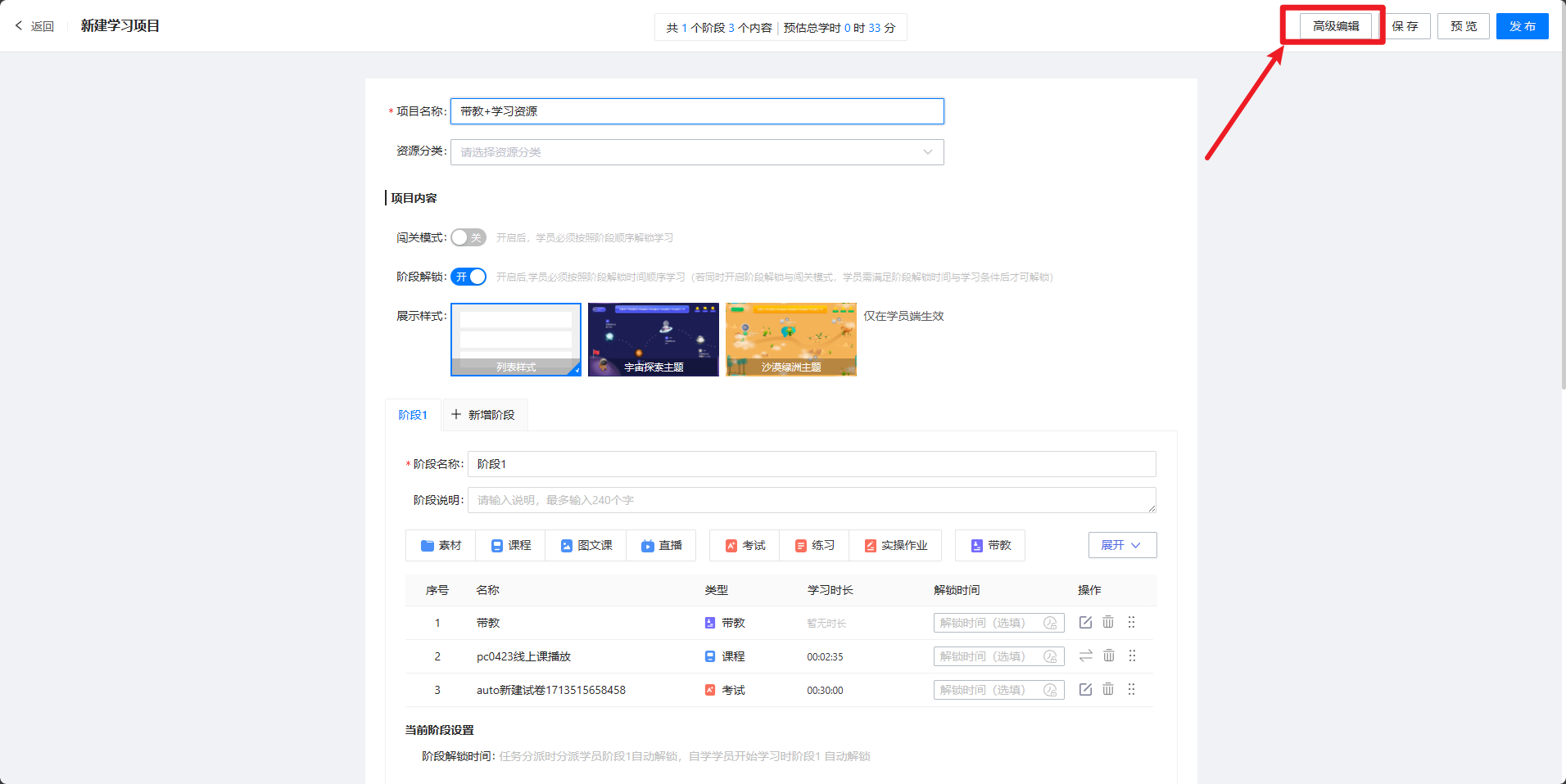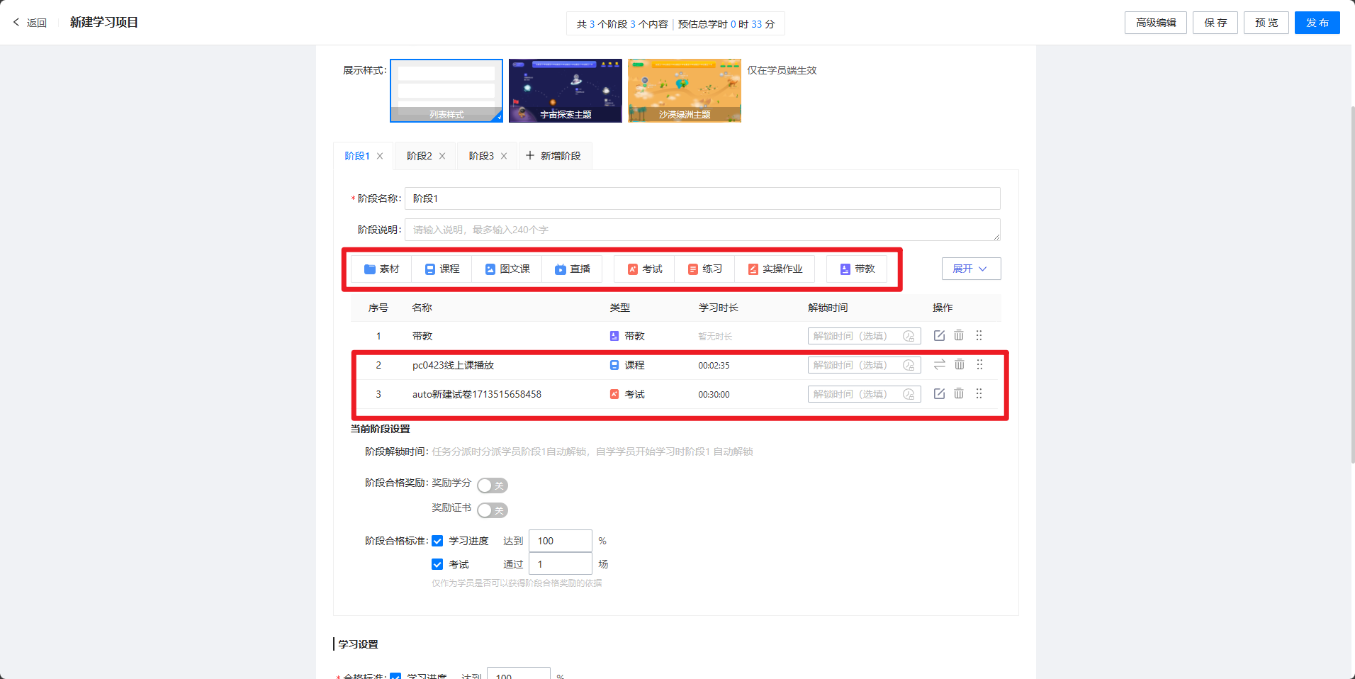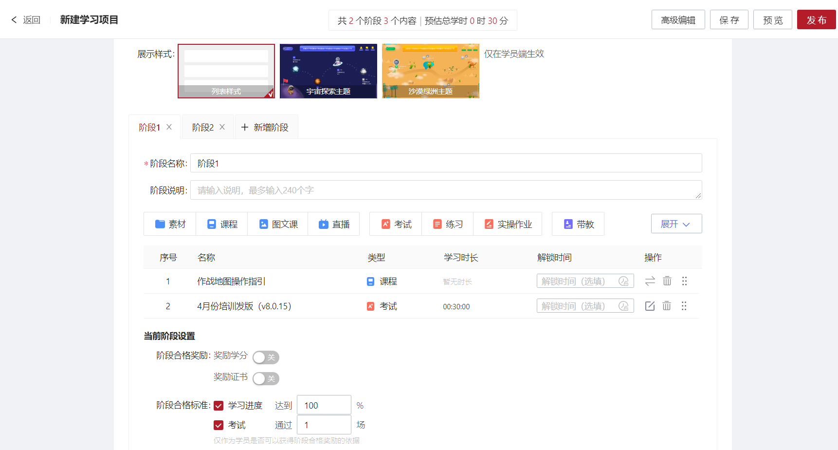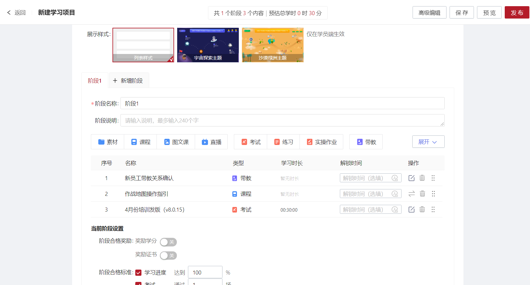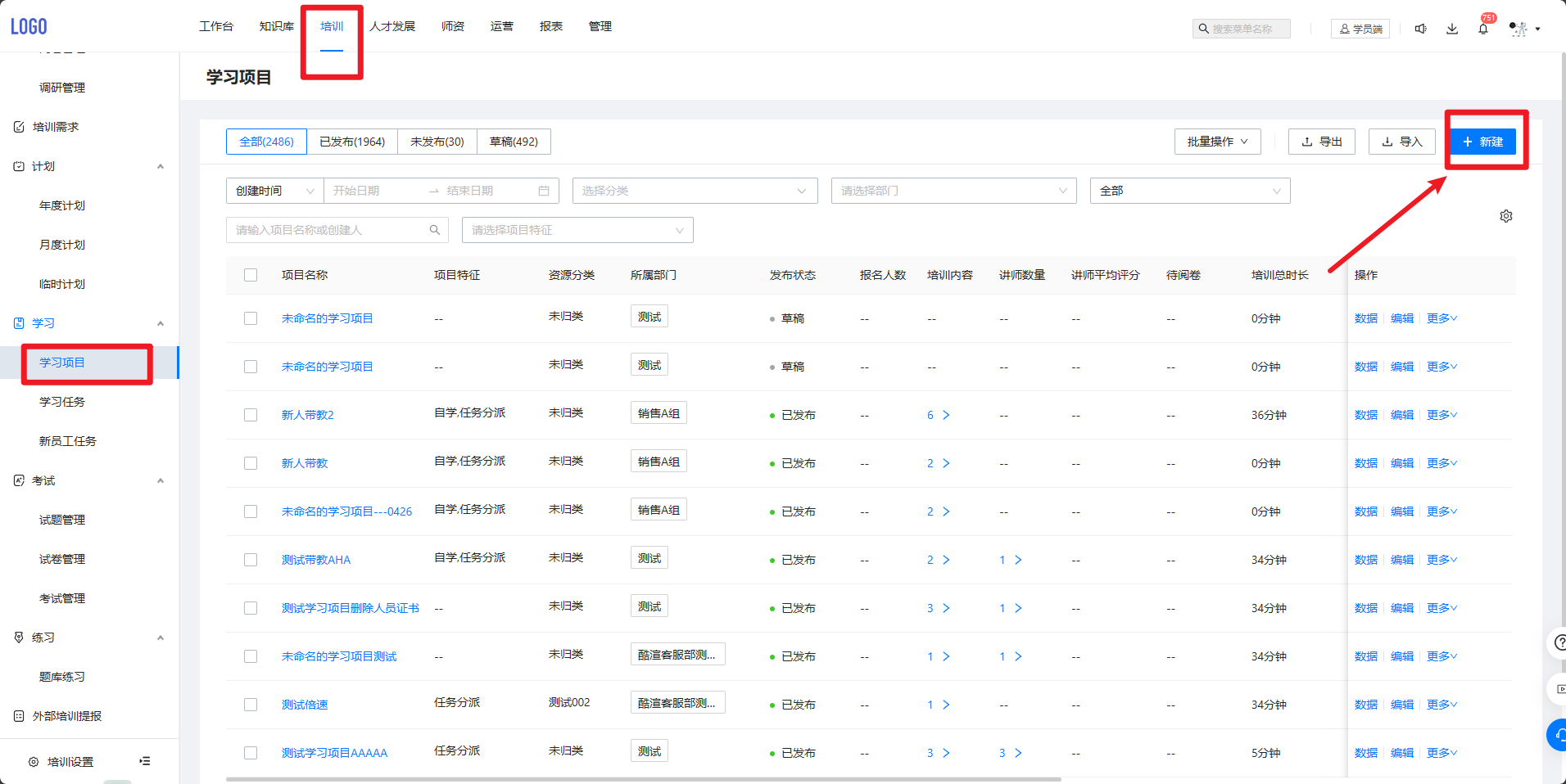 【管理端功能配置】:管理后台--培训--学习项⽬--新建