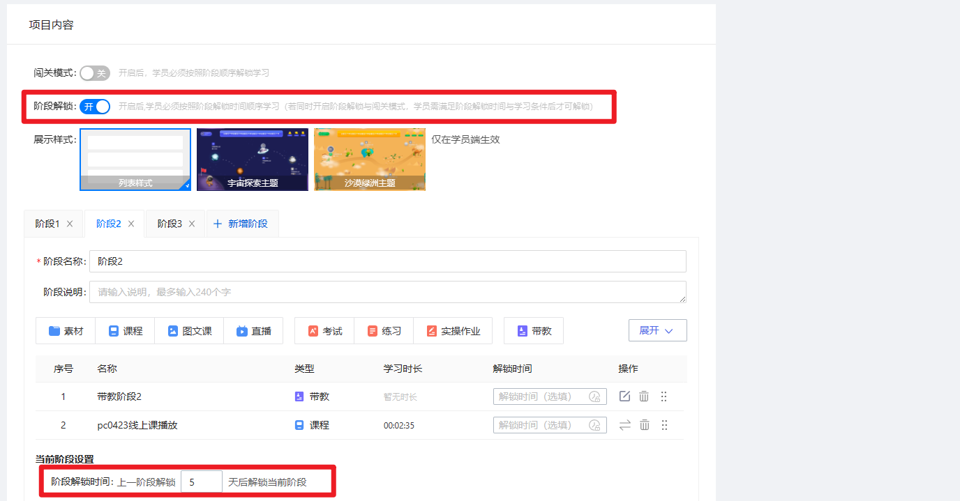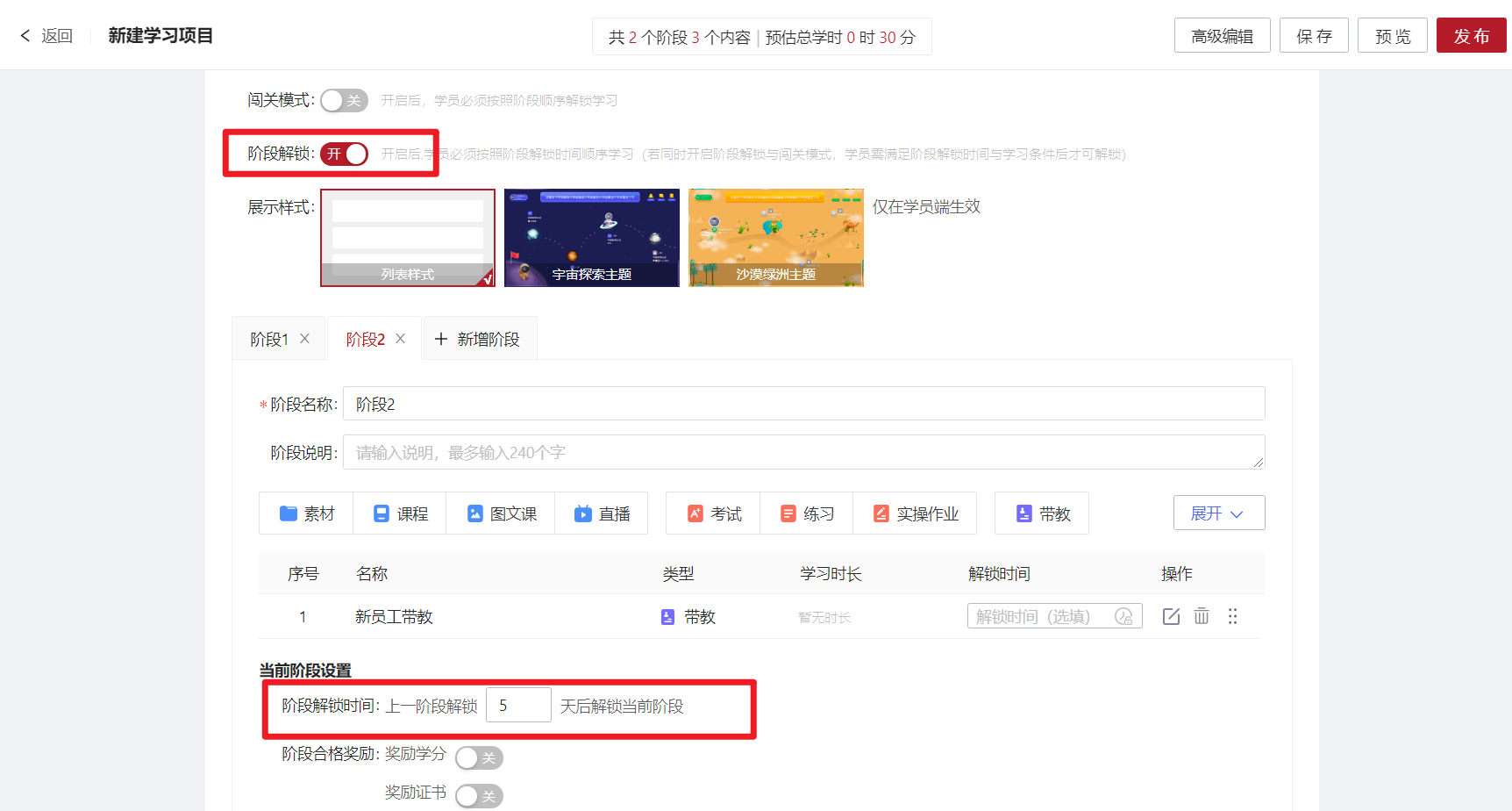 若管理员需第一阶段带教持续一周,一周后再开展第二阶段带教,则可在阶段2设置阶段解锁时间