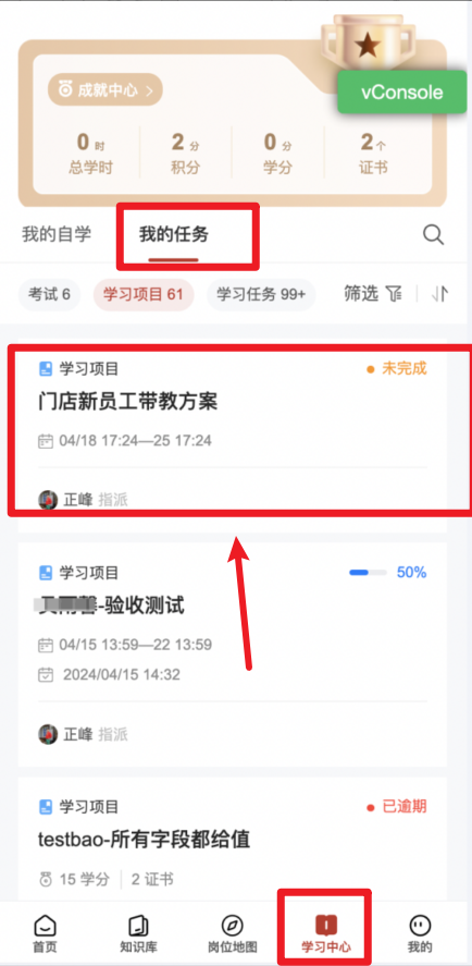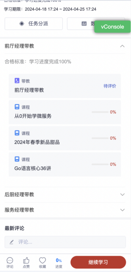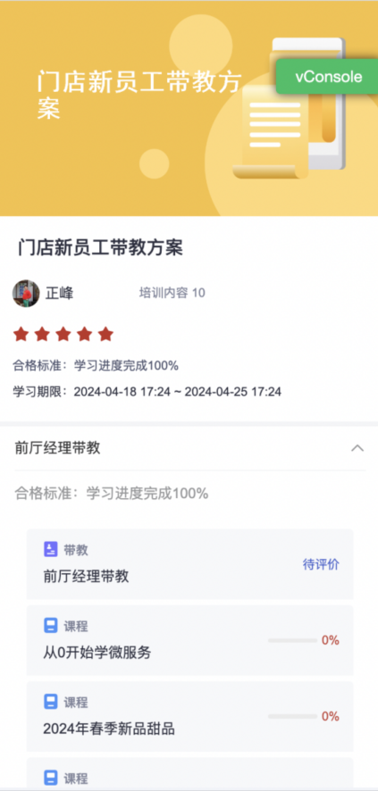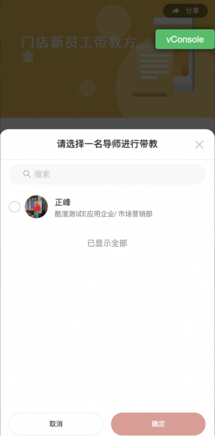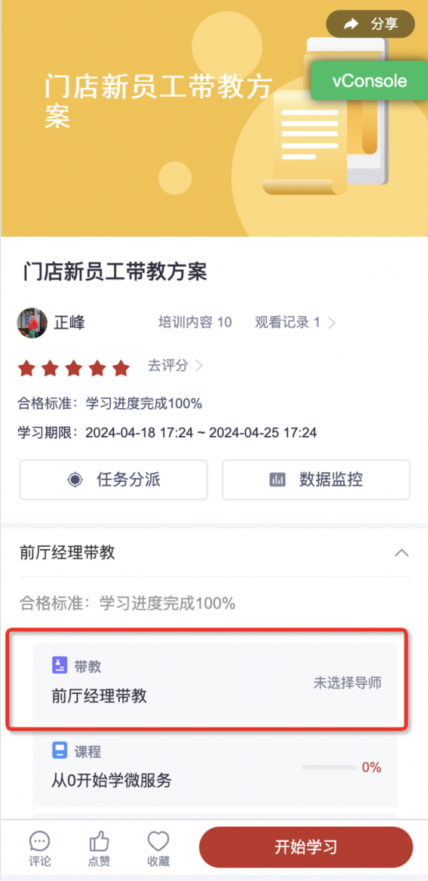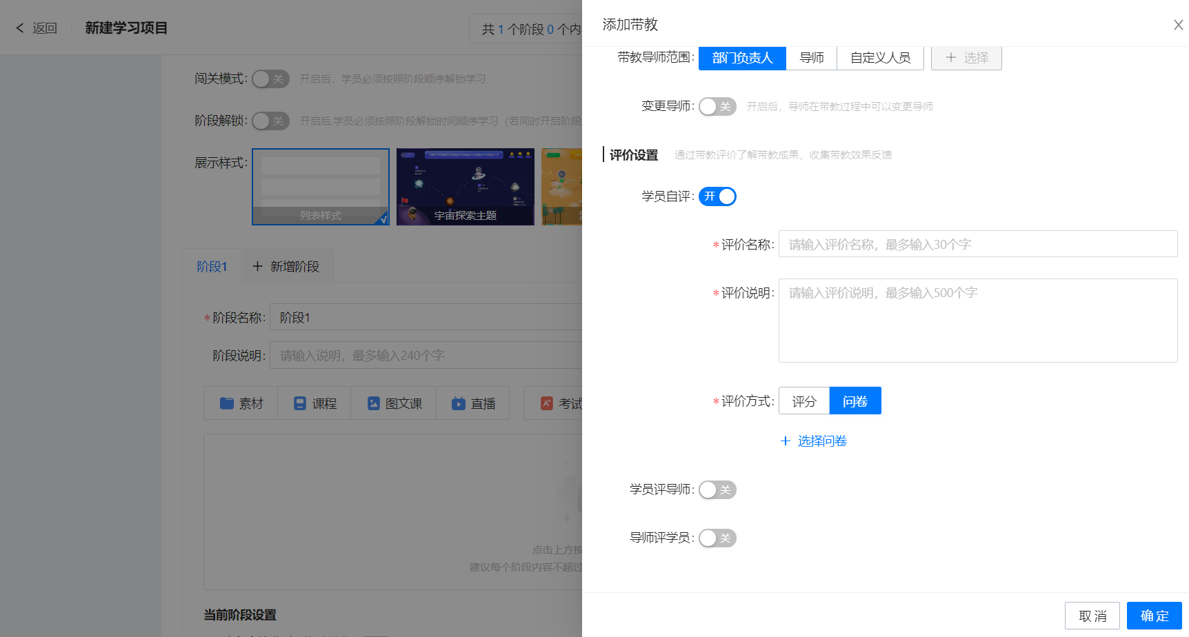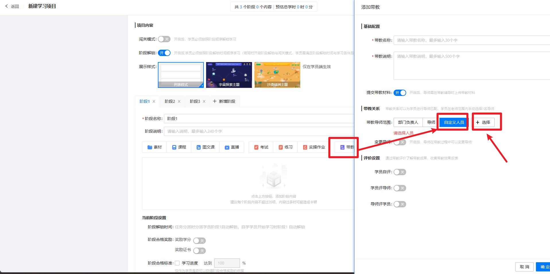 设置多个学习项目阶段,加入带教资源,配置不同的导师匹配规则(如第一阶段加入带教,导师范围选择自定义人员,选范围-选择前厅负责人用户组)