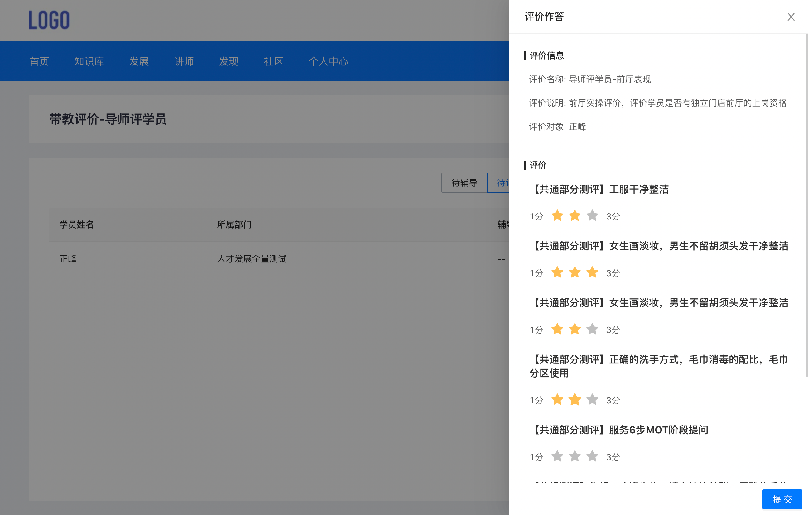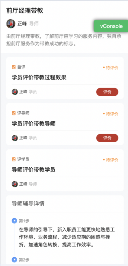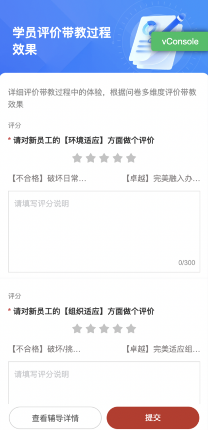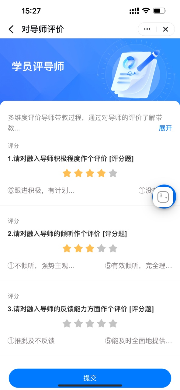 我们可提前在问卷管理中新建企业在带教效果评估时希望考察的问卷内容,在评价设置时进行引用,届时,学员与导师可完成指定问卷作答。
