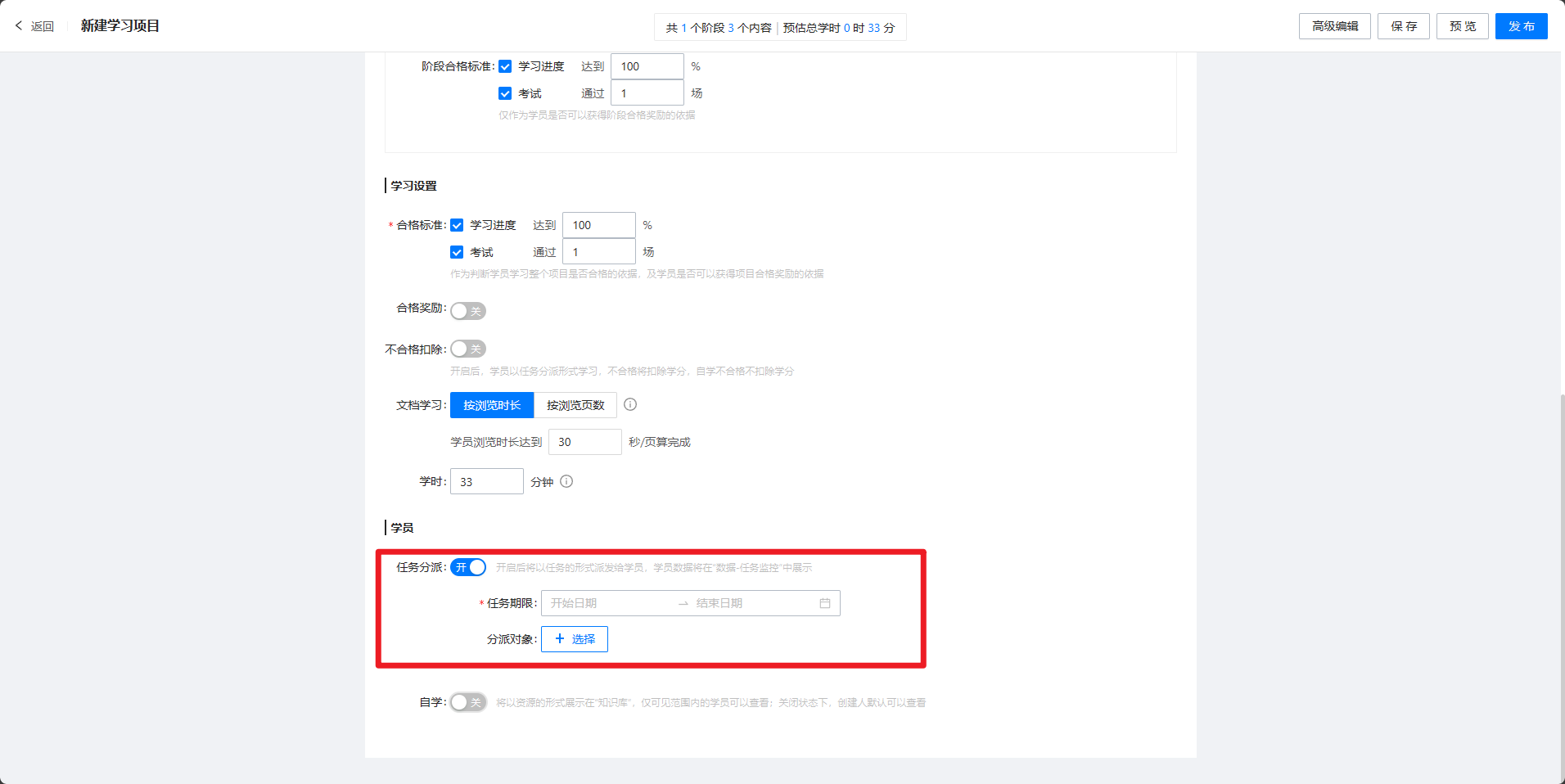 若管理员以任务形式派发学员学习,可直接开启“任务分派”按钮,设置任务期限及分派对象即可;