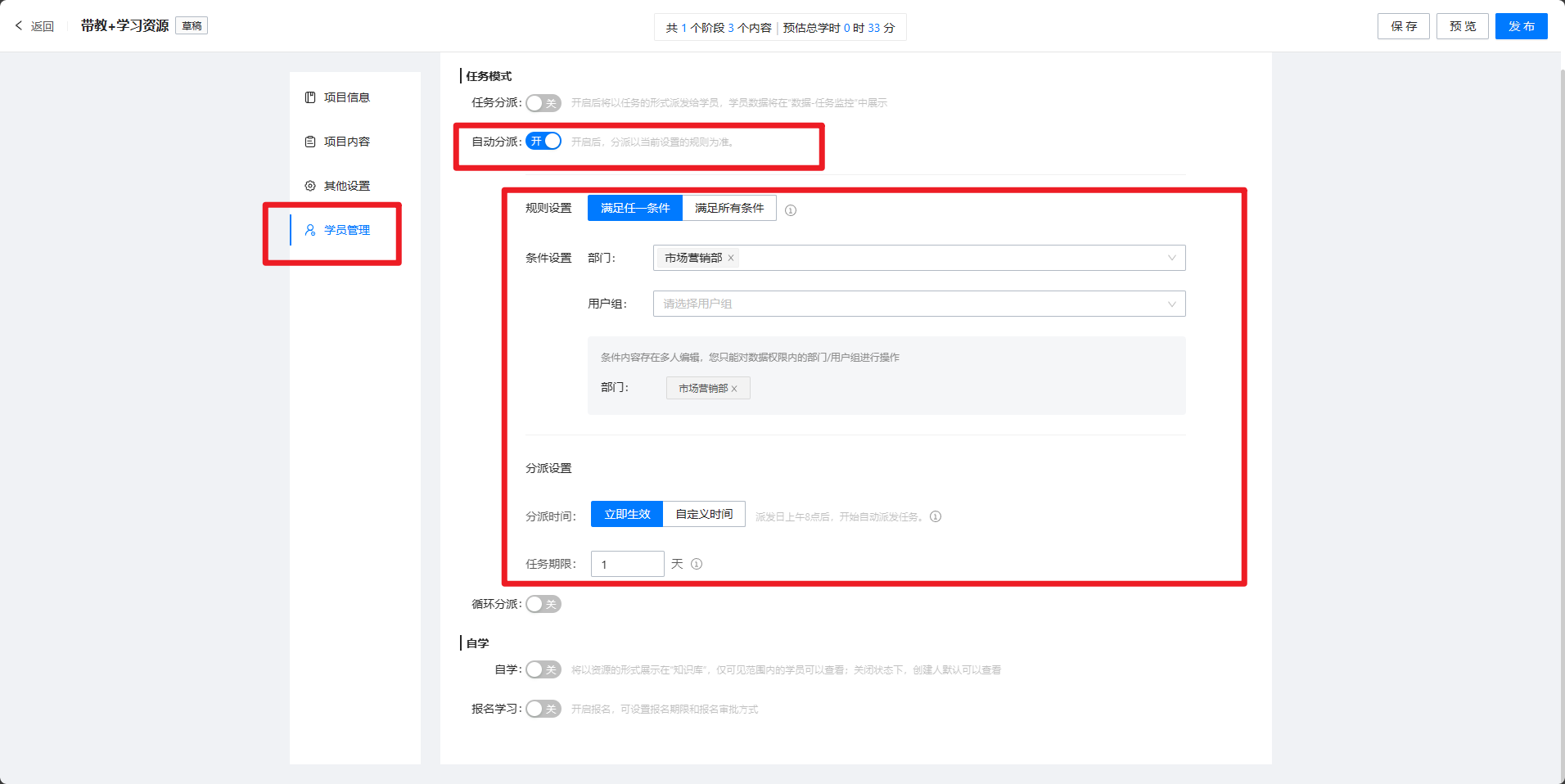 若管理员需以自动分派形式派发学员,可将学习项目切换到“高级编辑”模式,然后在学员管理页面下打开“自动分派”按钮,设置分派对象的条件,符合条件的学员将自动收到该学习项目。