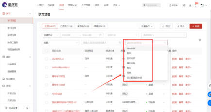 学习项目支持依据学习项目的自学、付费、报名、任务分派、循环分派、自动分派等业务特性进行组合筛选,快速查询特定业务特性的项目;
