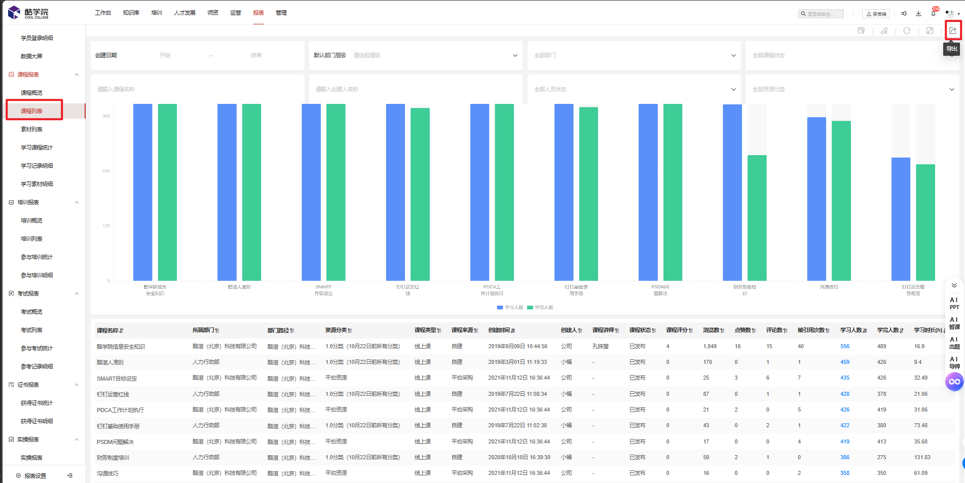 若管理员想要查询某一课程的学习情况,例如:学习人数、学完人数等,则进入【课程列表】页面即可查询或导出。课程列表支持从学习人数跳转至具体人员明细页。