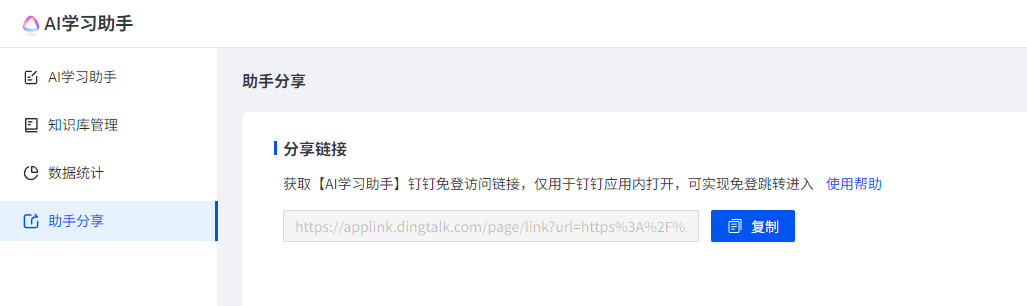 授权AI学习助手管理权限的角色,可在管理端-培训-AI学习助手-助手分享菜单下,一键复制分享内链。