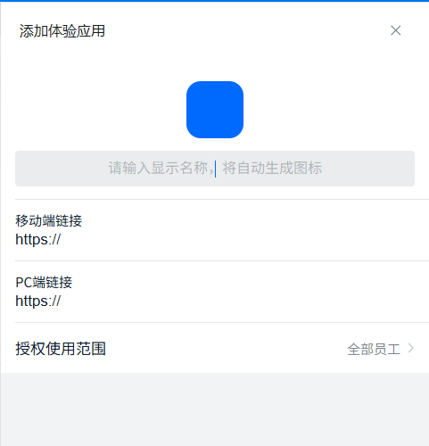第三步:将分享内链分别粘贴在移动端、PC端链接输入栏中,并自定义应用图标、名称,且设置授权使用范围后,保存即可,且可根据需要将应用添加至工作台指定分组